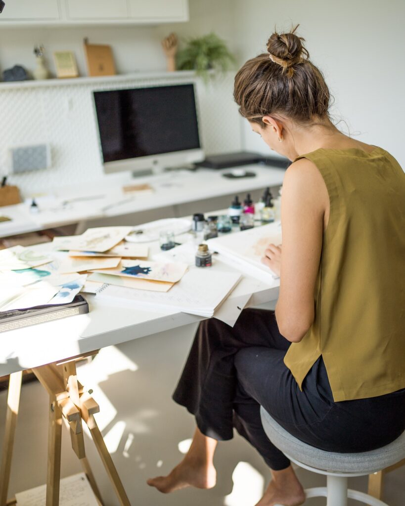 Od zawsze towarzyszy mi rysunek. Lubię pracę z linią, uważną obserwację świata i moment, w którym z realistycznych form zaczynają wyłaniać się prostsze układy – geometria, rytm, relacje między kształtami. Często punktem wyjścia jest dla mnie natura i pejzaż, które stopniowo porządkuję i upraszczam, szukając bardziej syntetycznych kompozycji. Podczas studiów na akademii ważną częścią mojej praktyki były szybkie, codzienne szkice – zapisy zwyczajnych sytuacji, ludzi i miejsc. Do tych szkicowników wciąż chętnie wracam; są dla mnie źródłem obserwacji i impulsów do dalszej pracy. W mojej twórczości często sięgam po symbol. Interesuje mnie opowiadanie obrazem o tym, co trudne do nazwania słowami. Zwyczajny przedmiot może nagle stać się nośnikiem głębszego sensu. W pracy dyplomowej połączyłam te dwa obszary, tworząc akwaforty pełne roślinnych symboli, nawiązujących do średniowiecznych Hortus Conclusus (ogrodów zamkniętych), gdzie każdy kwiat niesie określone znaczenie. Od kilku lat odkrywam także kaligrafię i liternictwo. Tu również dzieje się coś podobnego: tekst pozostaje nośnikiem informacji, a sposób zapisu – ekspresja i forma litery – wpływa na jego sens i odbiór. Najczęściej pracuję w ograniczonej, spokojnej kolorystyce, szukając różnorodności raczej w fakturze, rytmie i kompozycji niż w intensywnych barwach. Chciałabym, aby moje prace były zaproszeniem do krótkiego zatrzymania się i wejścia w małą historię – taką, którą każdy może odczytać na swój sposób.
