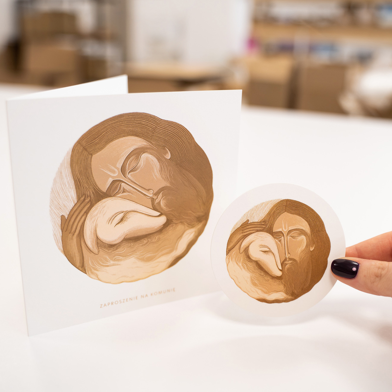 10 karteczek w kształcie koła z ilustracją Pasterza, doskonale komponuje się z zaproszeniem komunijnym Pasterz.