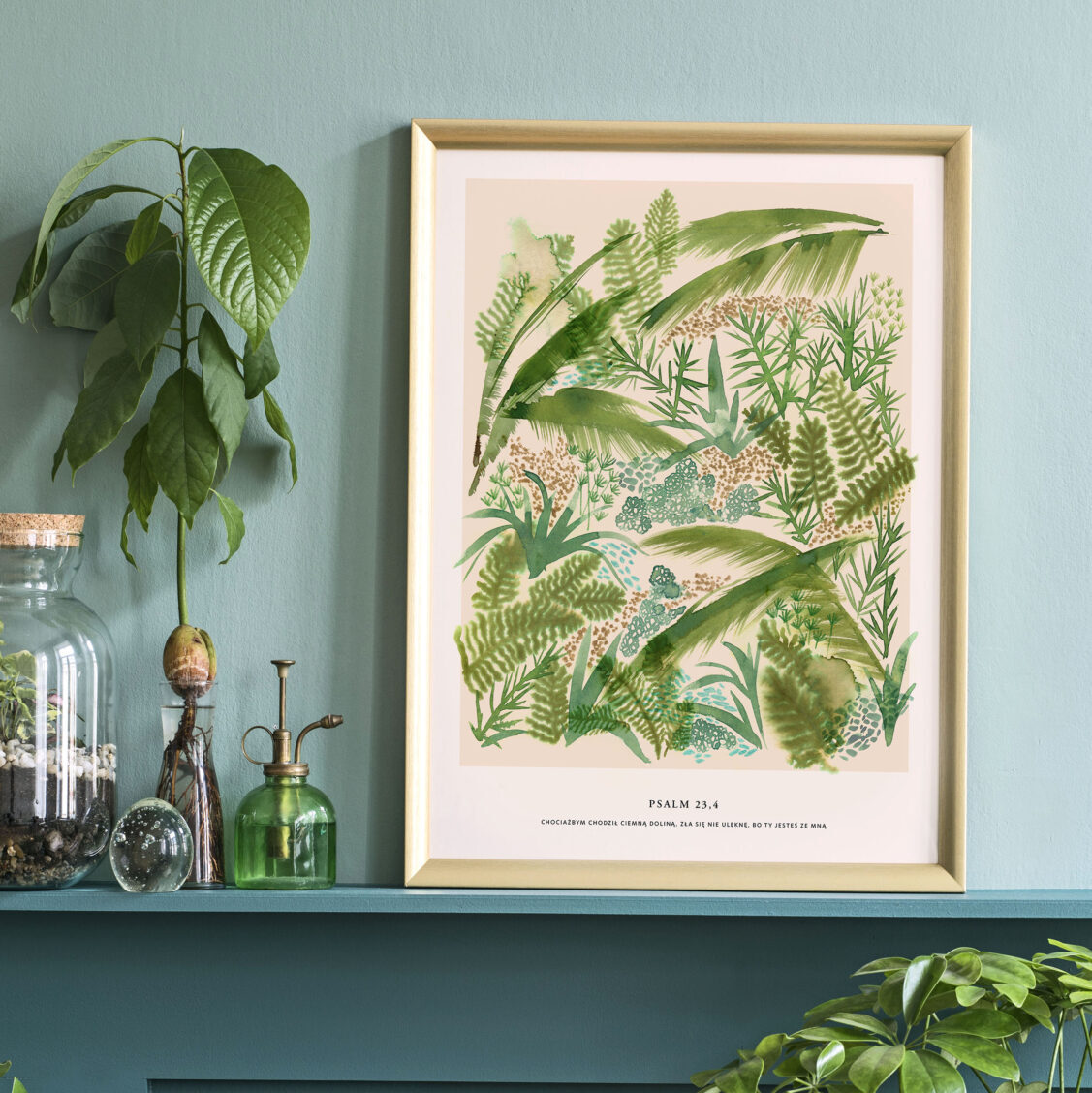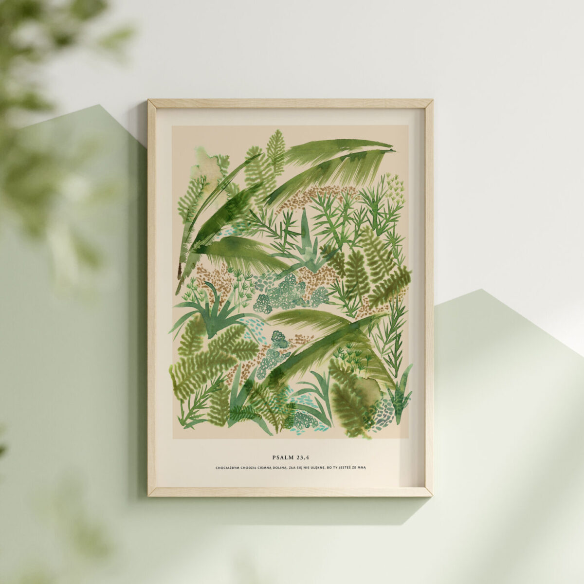 Autorska akwarela dżungli z cytatem “Chociażbym chodził ciemną doliną, zła się nie ulęknę bo Ty jesteś ze mną: Ps 23,4