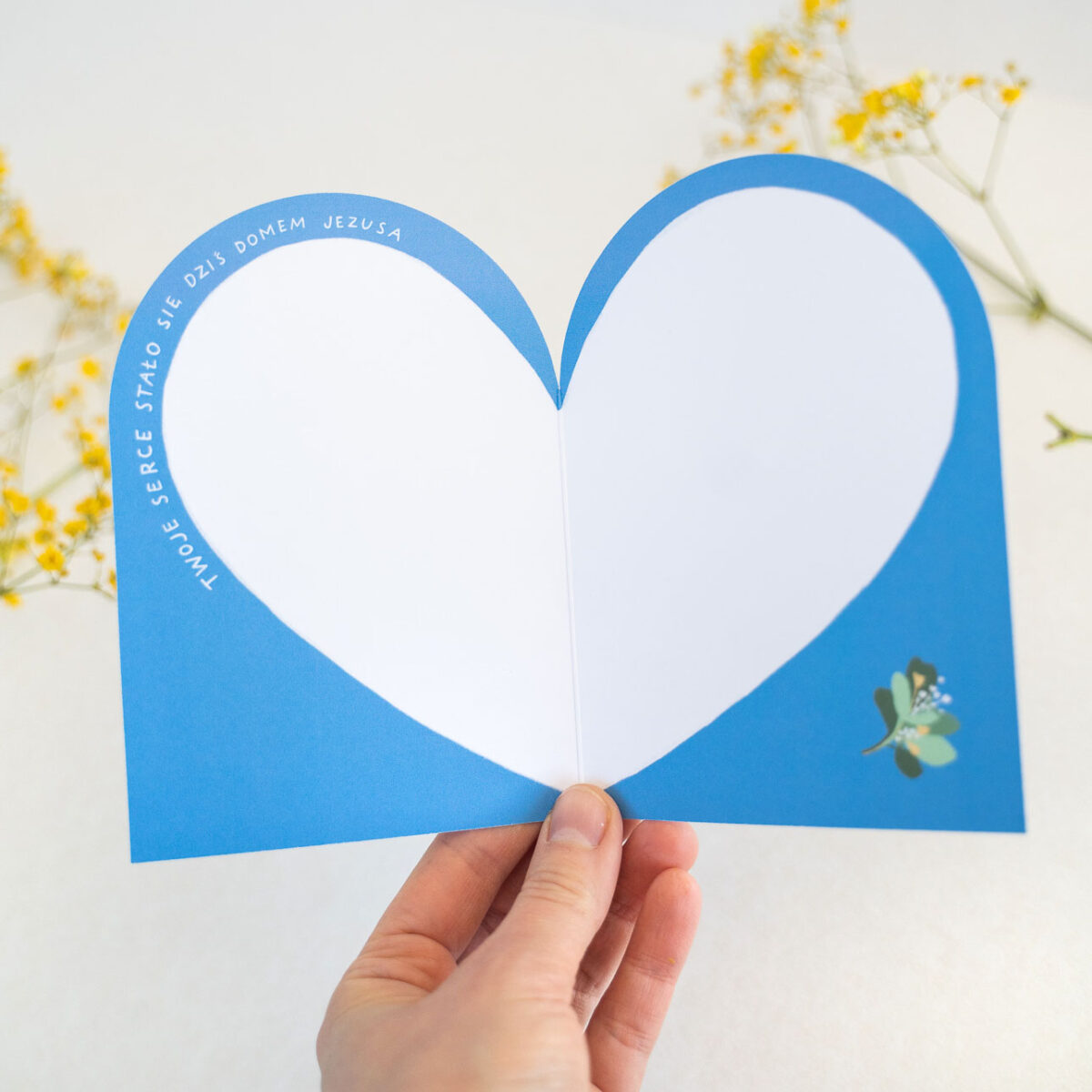 Otwierana kartka na Komunię, w środku tekst ” Twoje serce stało się dziś domem Jezusa” i miejsce na życzenia.