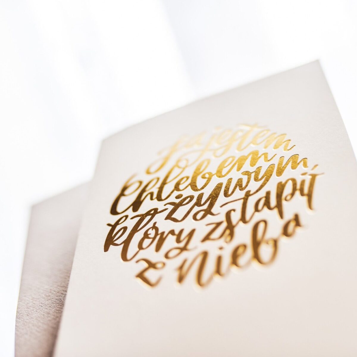 Elegancka kartka na Komunię ze złotym napisem z Ewangelii wg św. Jana 6,51: