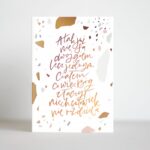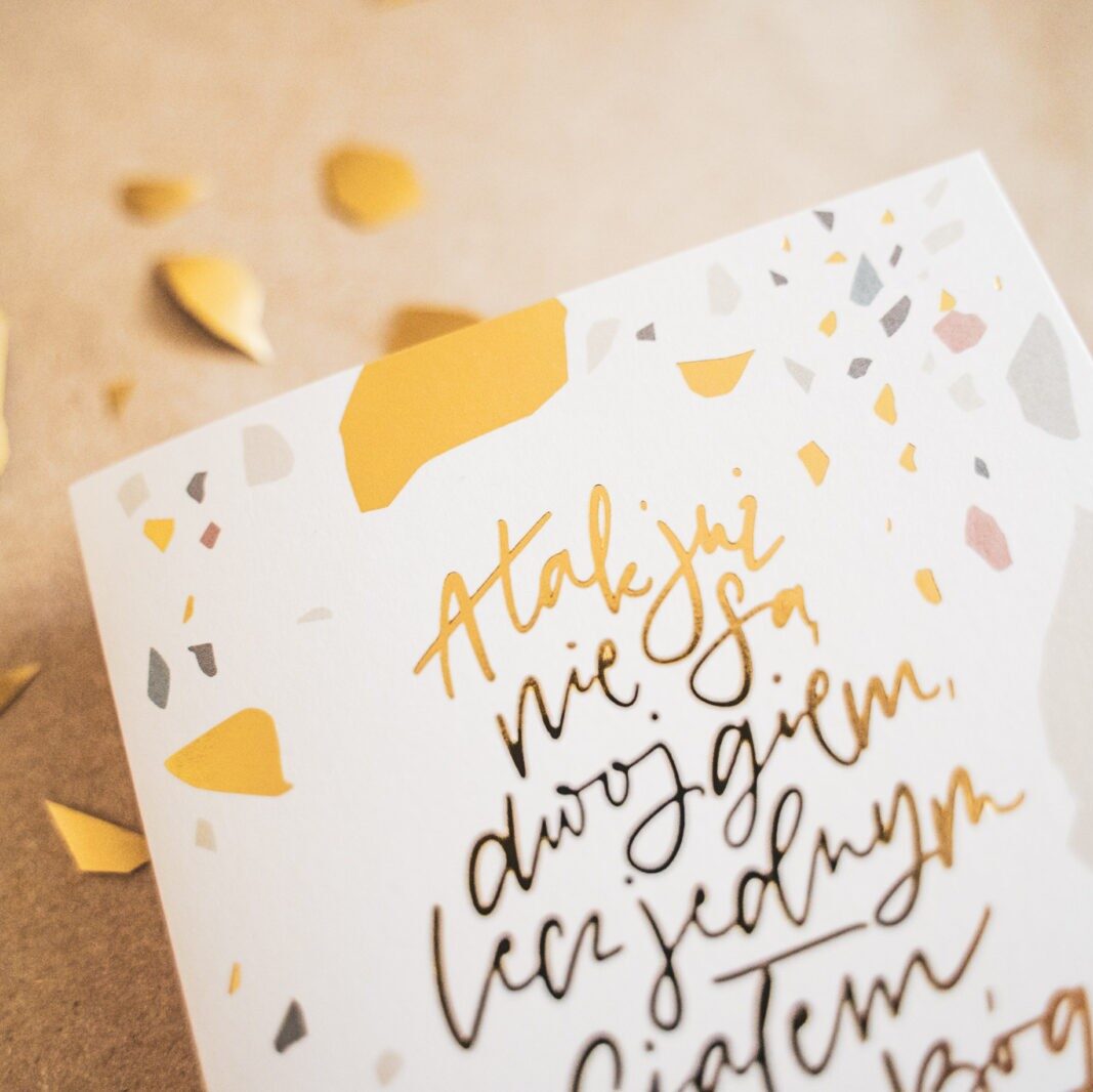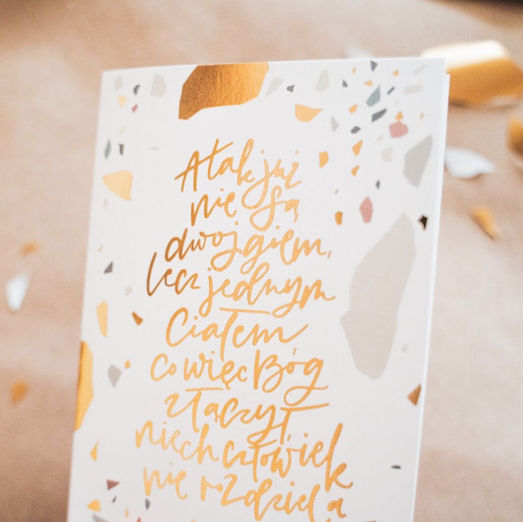 Elegancka kartka na ślub lub rocznicę ze miedzianym napisem z Ewangelii św. Marka 10,8: