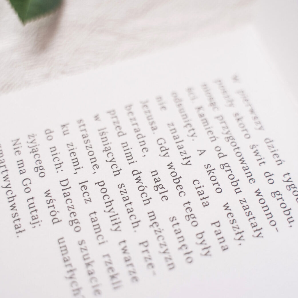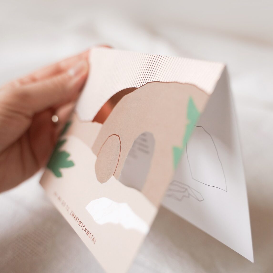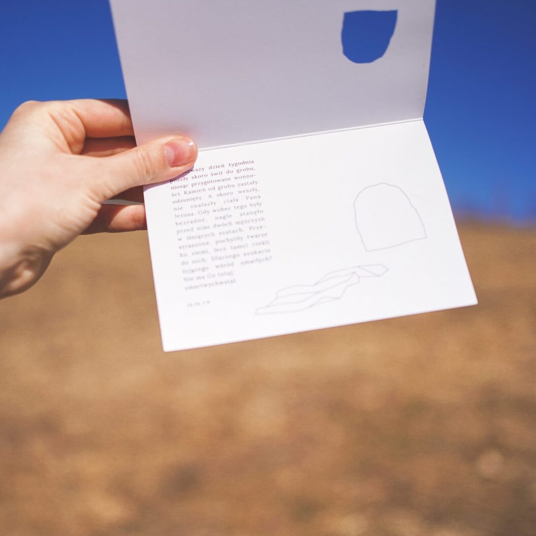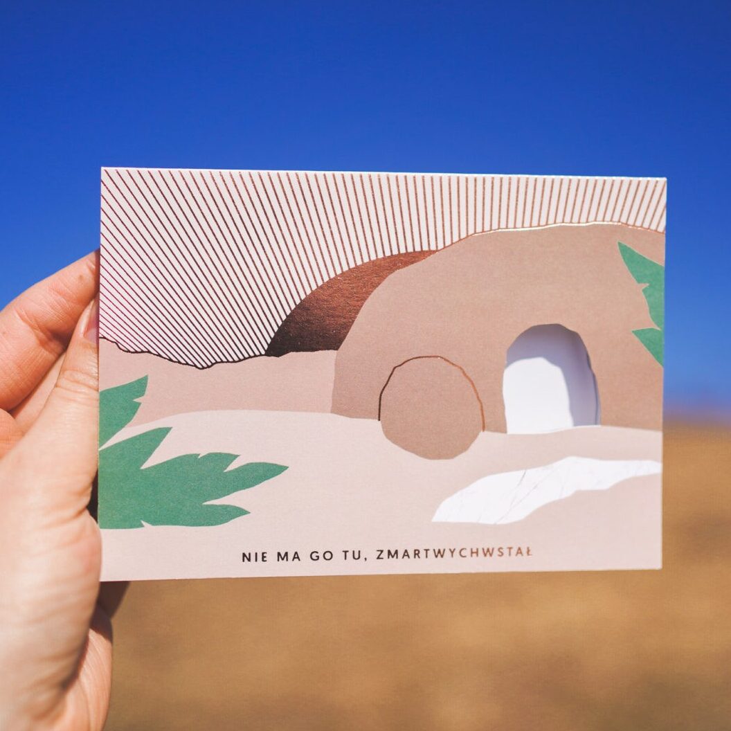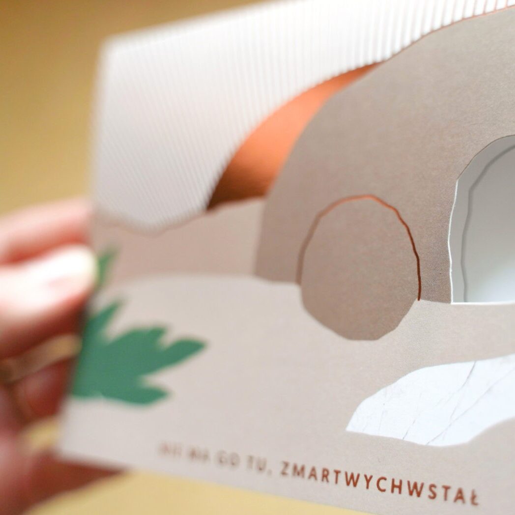 Otwierana kartka na Wielkanoc z uszlachetnieniem z różowego złota, z wyciętym otworem. Wewnątrz fragment Ewangelii Łk. 1-6
