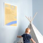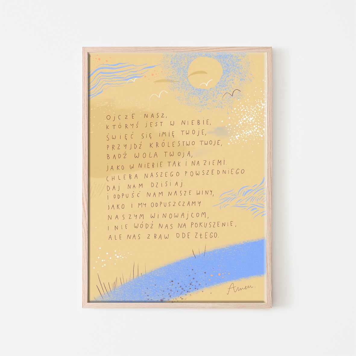 Plakat z modlitwą „Ojcze nasz” do pokoju dziecięcego. Sprawdzi się jako prezent dla dziecka, prezent na chrzest lub prezent na Pierwszą Komunię. Grafika wraz z plakatem z modlitwą „Aniele Boży” tworzy zgrany duet.