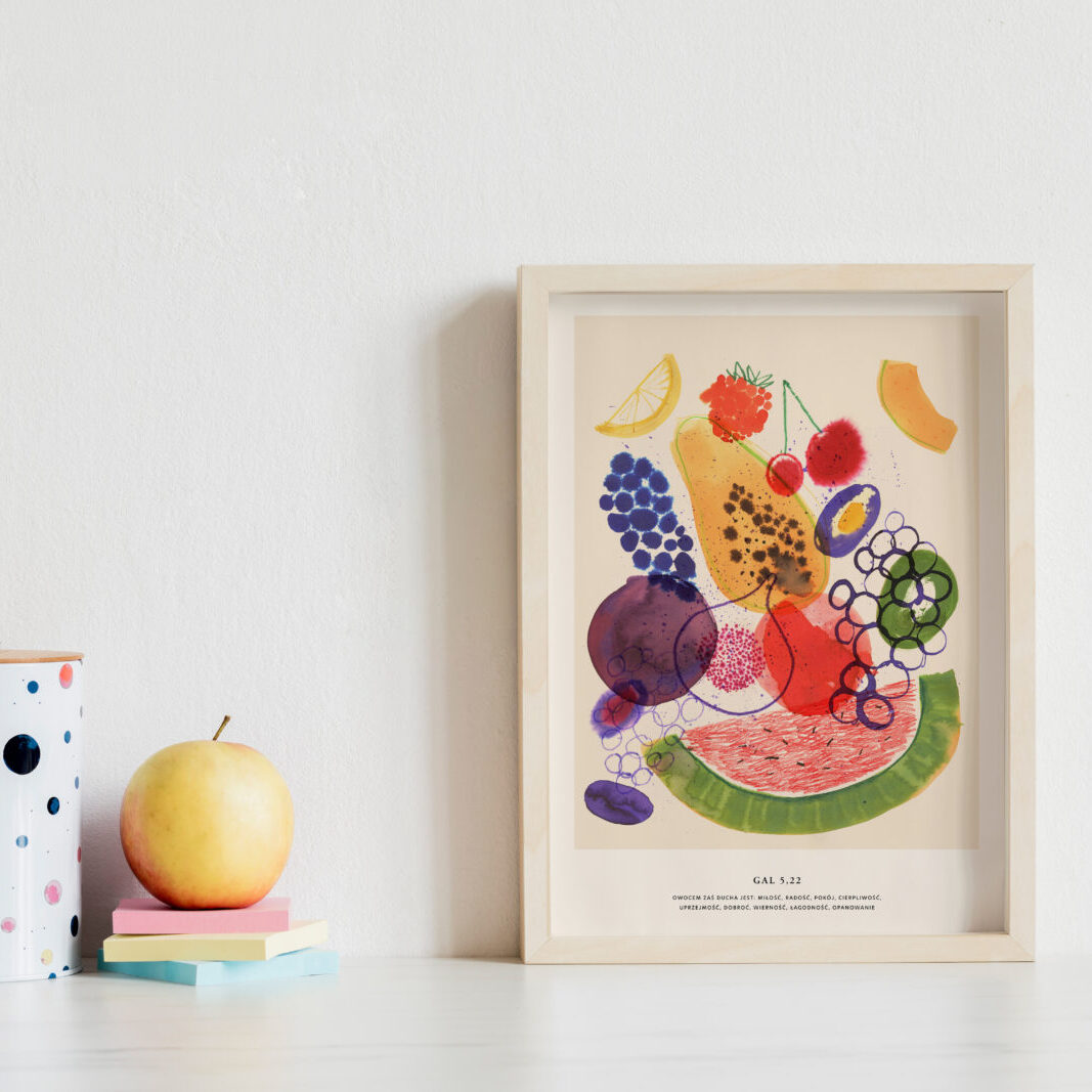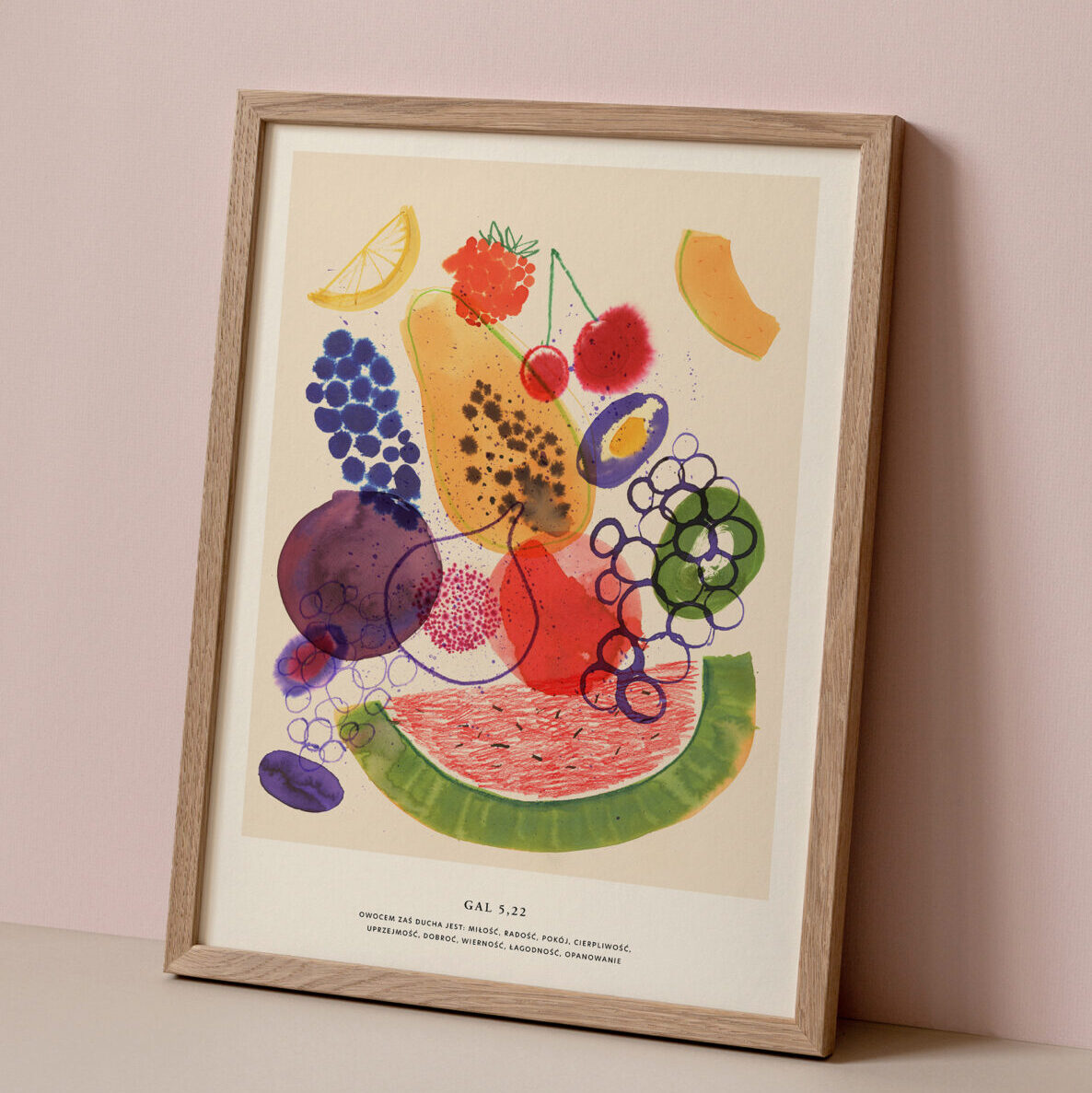 Autorska akwarela z cytatem “Owocem zaś ducha jest: miłość, radość, pokój, cierpliwość, uprzejmość, dobroć, wierność, łagodność, opanowanie.” Gal 5,22