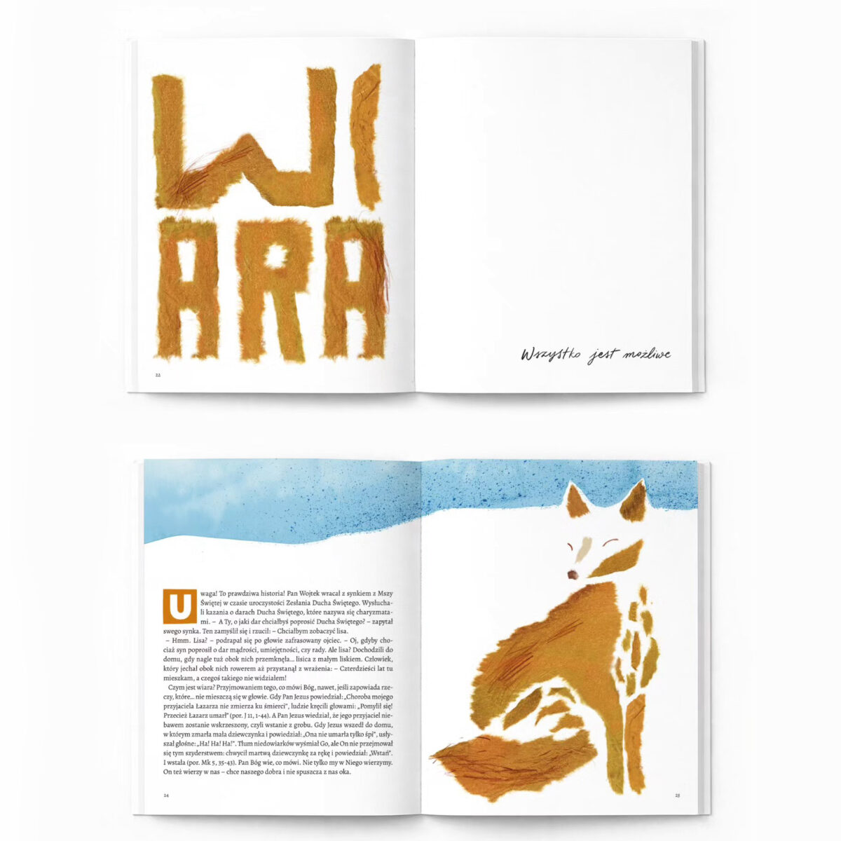 Są słowa, które słyszymy w kościele… ale nie zawsze łatwo je zrozumieć. Dusza, łaska, adoracja — brzmią pięknie, ale co tak naprawdę znaczą? „Słownik spraw niewidzialnych” powstał właśnie po to, żeby przybliżyć dzieciom to, co niewidzialne — w prosty, ciepły i angażujący sposób. To wyjątkowa książka stworzona we współpracy z Marcinem Jakimowiczem — dziennikarzem i ewangelizatorem, który w jasny i obrazowy sposób opisał rzeczy nie z tego świata. Każdej stronie towarzyszą autorskie, odręczne ilustracje i liternictwo naszego Studia. Pełne koloru, akwareli i wycinanek. Tak aby przez treść i artystyczną formę docierać do wyobraźni młodego czytelnika. Choć książkę stworzyłyśmy z myślą o dzieciach, jesteśmy pewne, że poruszy również dorosłych — to lektura, do której chce się wracać razem.