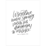 Plakat na ślub z cytatem z Pisma Świętego. Ten wyjątkowy prezent ślubny sprawdzi się idealnie do wnętrza mieszkania przyszłych małżonków. “Wszystkie wasze sprawy niech się dokonują w miłości.” 1 Kor 16,14