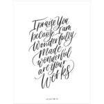 Minimalistyczna, nowoczesna grafika w angielskiej wersji językowej. Plakat idealnie sprawdzi się w sypialni i w salonie, pięknie zdobiąc wnętrze. “I praise you, because I am wonderfully made; wonderful are your works!”  “Dziękuję Ci, że mnie stworzyłeś tak cudownie, godne podziwu są Twoje dzieła” Psalm 139,14